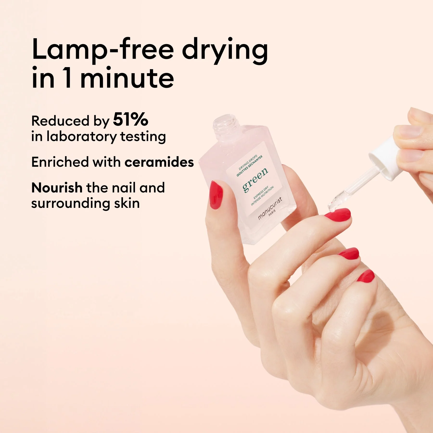 A Drying Drops segítségével a Green™ manikűröd 1 perc alatt megszárad. Ceramidekkel gazdagított formula, így a köröm és környéke tökéletesen ápolt marad. A nyomógombos kialakítás könnyű és rendkívül precíz alkalmazást tesz lehetővé: a manikűr végén egy csepp körmönként elegendő!