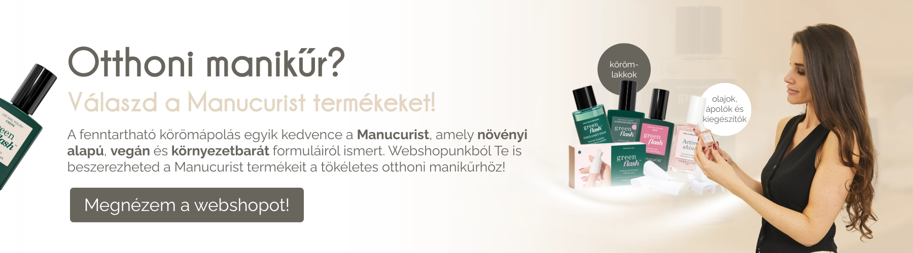 A tartós körömlakkozás nálunk nemcsak szép, hanem kímélő megoldás is. A Manucurist Green Flash termékcsalád 84%-ban természetes összetevőkből készül, vegán és környezetbarát formulával. Ennek köszönhetően gyengéd a körmökhöz, miközben tartós, fényes és elegáns végeredményt biztosít. A színek palettája folyamatosan megújul, így mindenki megtalálhatja a személyiségéhez és stílusához legjobban illőt.